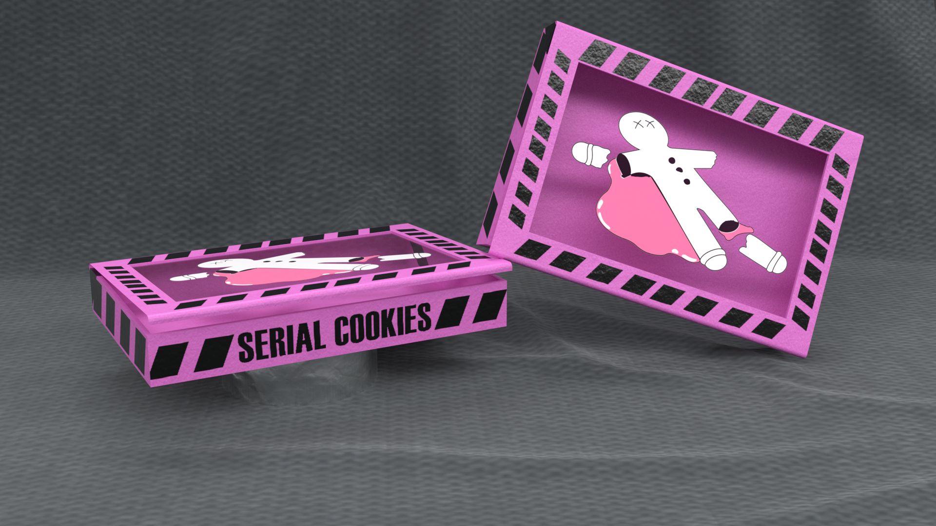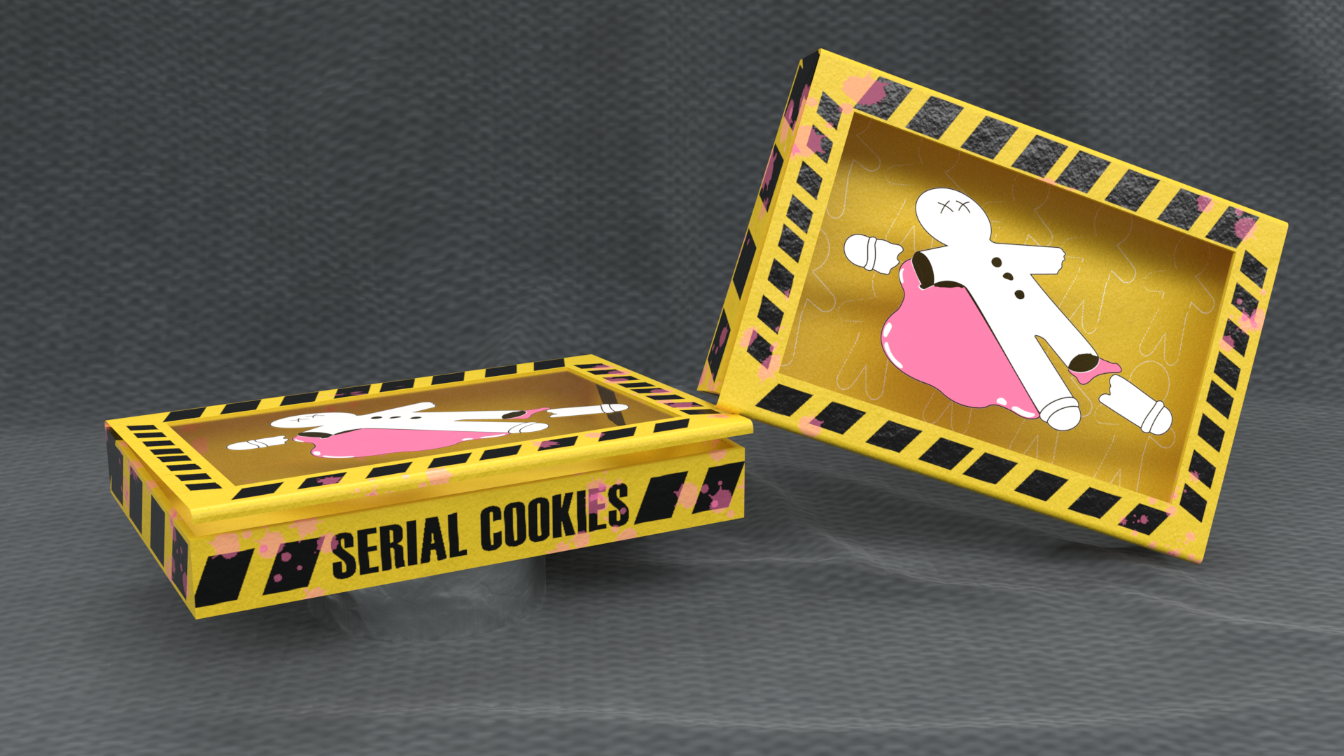 The packaging design began with a clear-topped box to showcase the cookies, incorporating police tape elements to strengthen the crime scene narrative. The choice of pink initially mirrored typical sweet treat packaging but was later adjusted to yellow to better align with the police tape concept. This shift was complemented by pink "blood splashes" and chalk outlines inside the box, adding layers of discovery and interaction for the consumer.